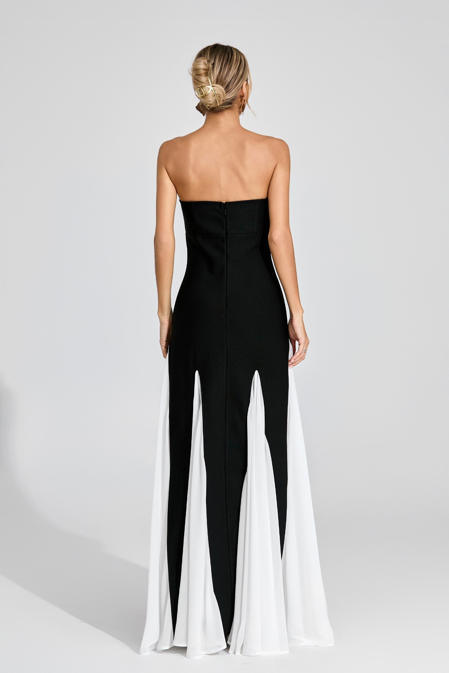 Design Details: This striking strapless gown features a sleek black column silhouette contrasted with dramatic white chiffon godet inserts that create elegant volume and fluid movement. The minimalist bodice accentuates the shoulders and neckline, while the floor-length hem ensures a graceful, elongating effect. Back zipper closure for a seamless fit.