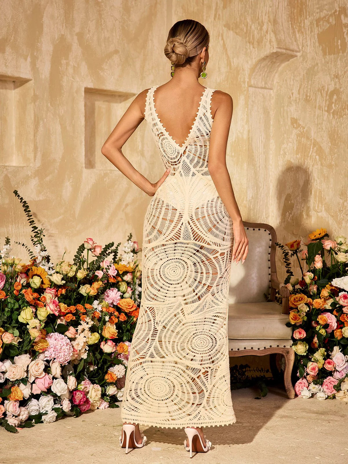 Design Details: A striking full-length dress woven in geometric lacework, showcasing circular and linear patterns that sculpt and highlight the body. Features a plunging V-neckline mirrored by a deep V-back, sleeveless cut, and a softly flared hem. Semi-sheer finish makes it ideal as a statement layering piece.