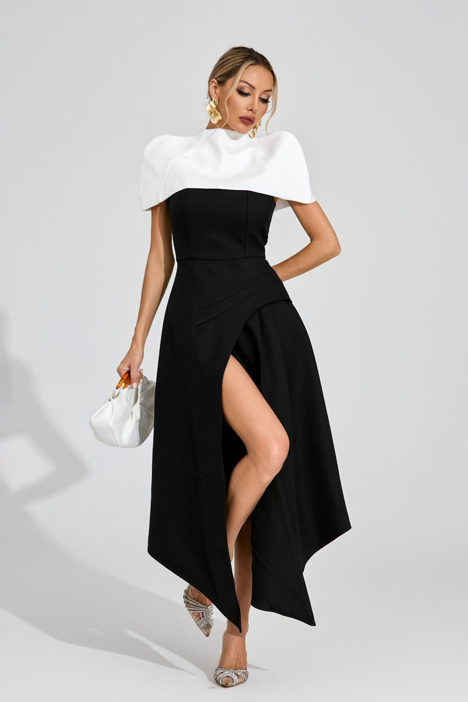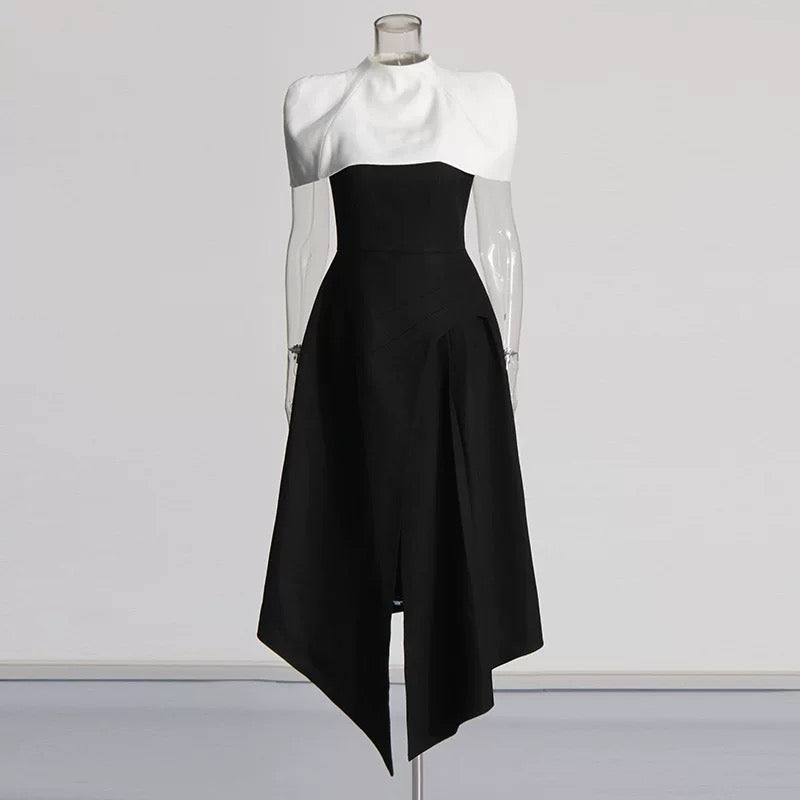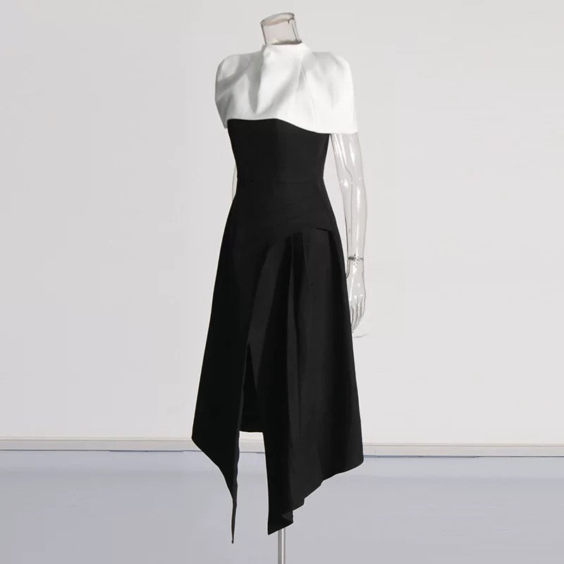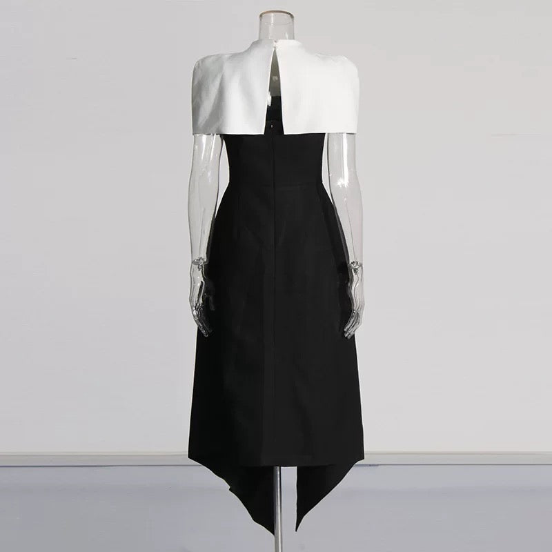 - Elegant high neckline with a dramatic white cape overlay, split at the back for a sculptural effect