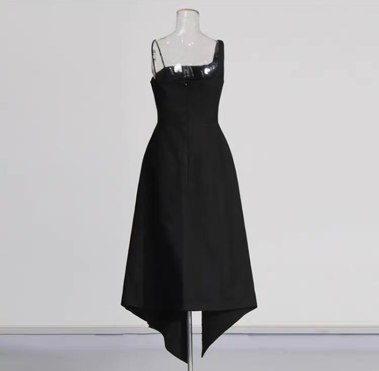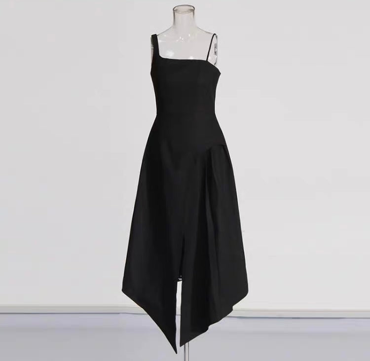 - Draped front skirt with an asymmetrical hemline, adding movement and sophistication