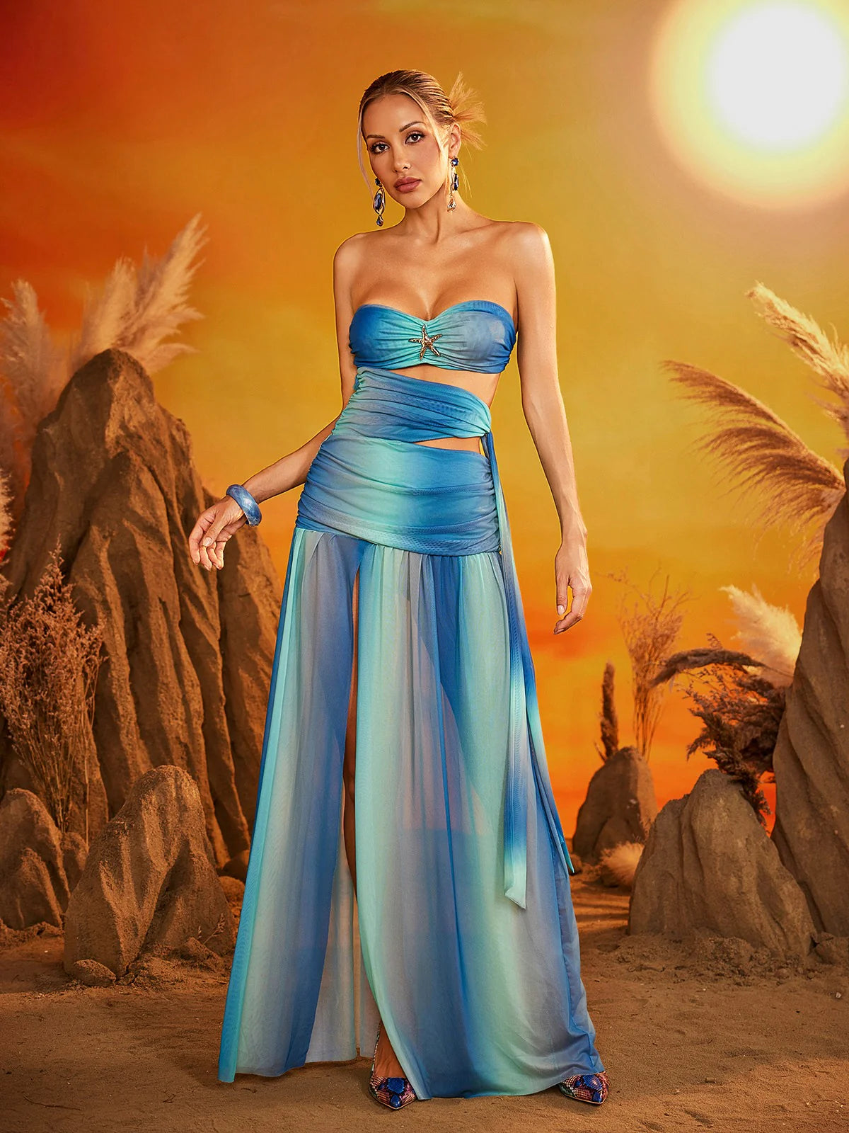 Breathtaking like the sea at golden hour, the Oceane Strapless Star Gown is a fluid fusion of color and sensuality. The ruched bandeau-style bodice features a shimmering starfish embellishment at the center, while a soft, sheer mesh overlay in layered blue tones flows over a high-slit skirt. Cutout sides accentuate the waist, and a tie-back bow adds a breezy elegance to the open back. Lightweight and glowing with coastal energy, this gown captures a mermaid fantasy reimagined for the modern muse.