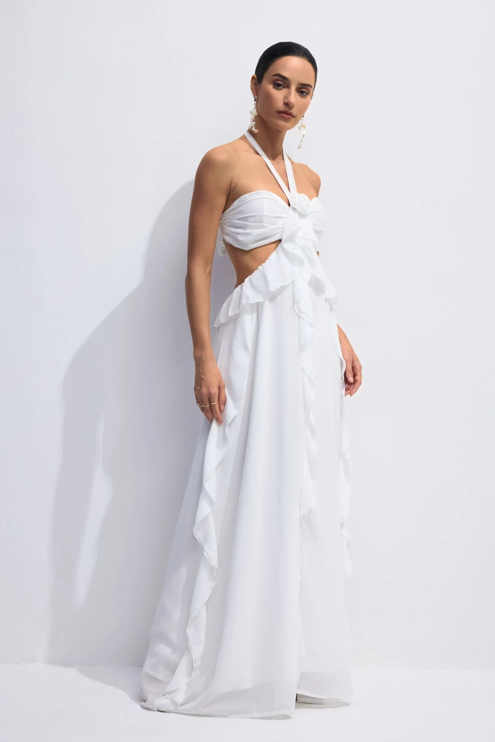 Design Details: This dreamy white halter-neck dress features a sweetheart bodice with an elegant front knot, cascading ruffles, and seductive cutouts at the front and back. The full-length skirt flows gracefully with every step, and the lightweight chiffon creates a romantic, ethereal silhouette.