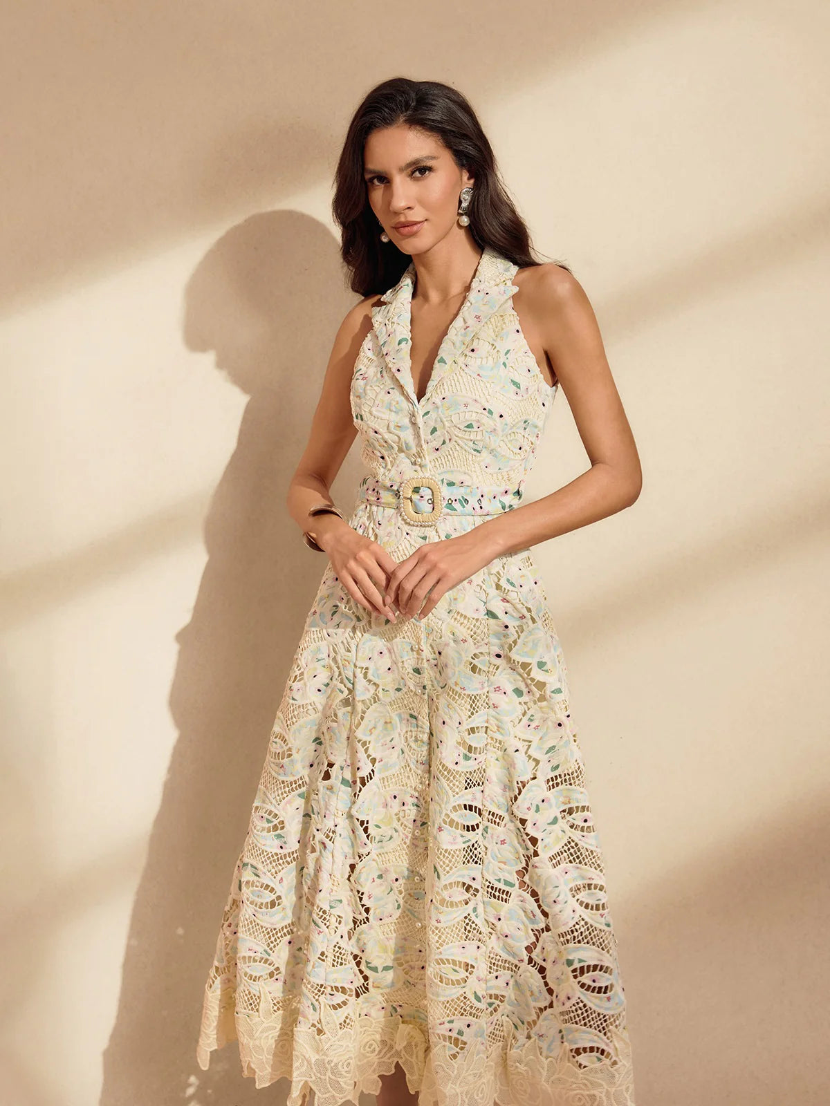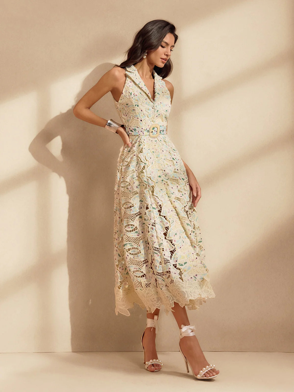 A feminine sleeveless lace midi dress featuring a structured collar neckline, pastel floral embroidery, and a fitted waist with a matching belt and decorative buckle. The skirt flows into a full, scalloped hem with intricate lace detailing for a refined, romantic finish. Slight stretch for added comfort.