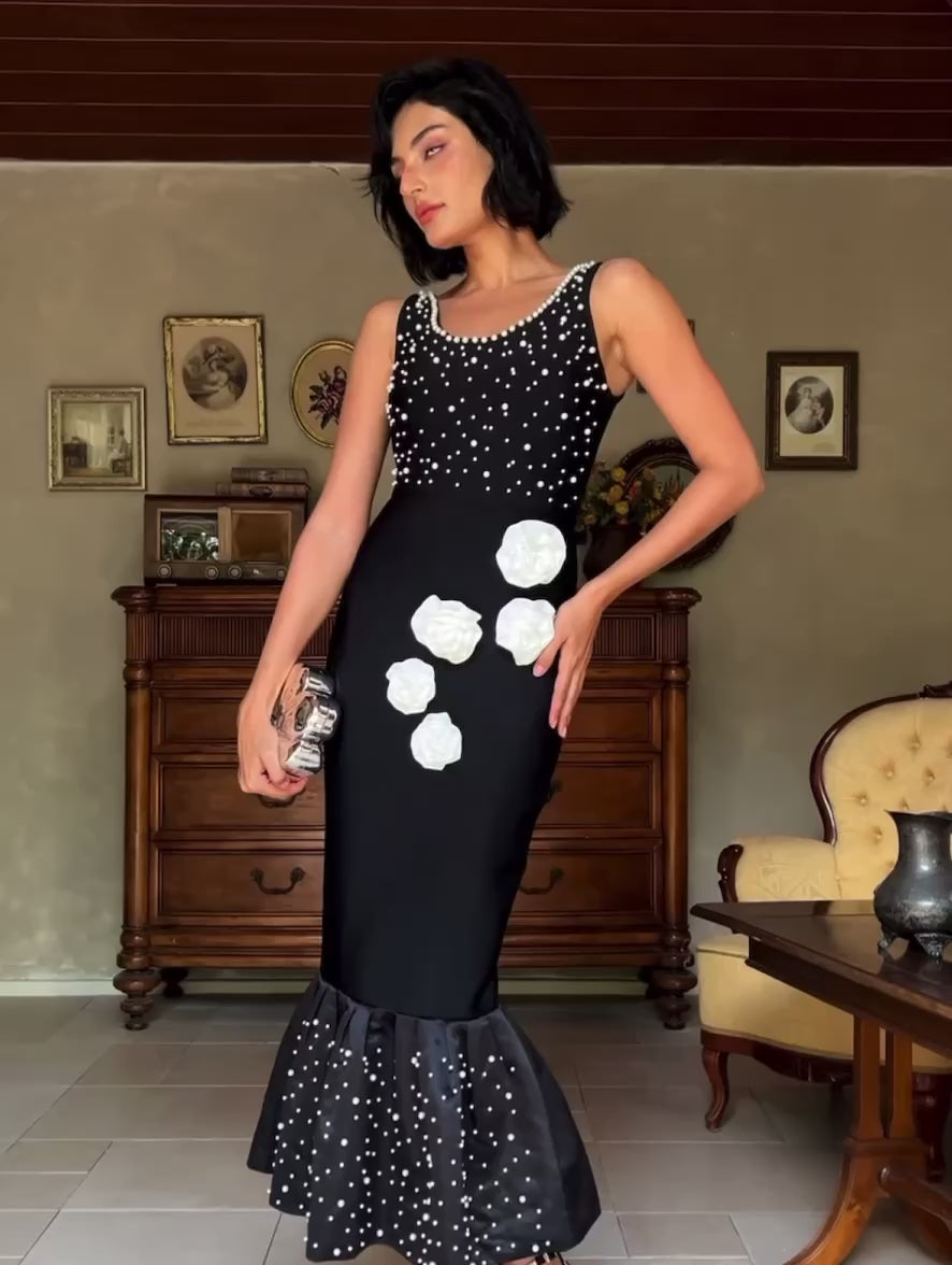 Show off your elegant and playful side with our Plunge Neck Pearl Flower Midi Dress. The stunning plunging neckline and delicate flower detailing will make you feel confident and beautiful. Perfect for any special occasion or a night out, this dress will surely turn heads. Embrace your inner goddess and make a statement in this dress today!