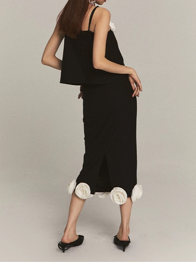 - Two-piece set featuring a camisole top and a fitted midi skirt