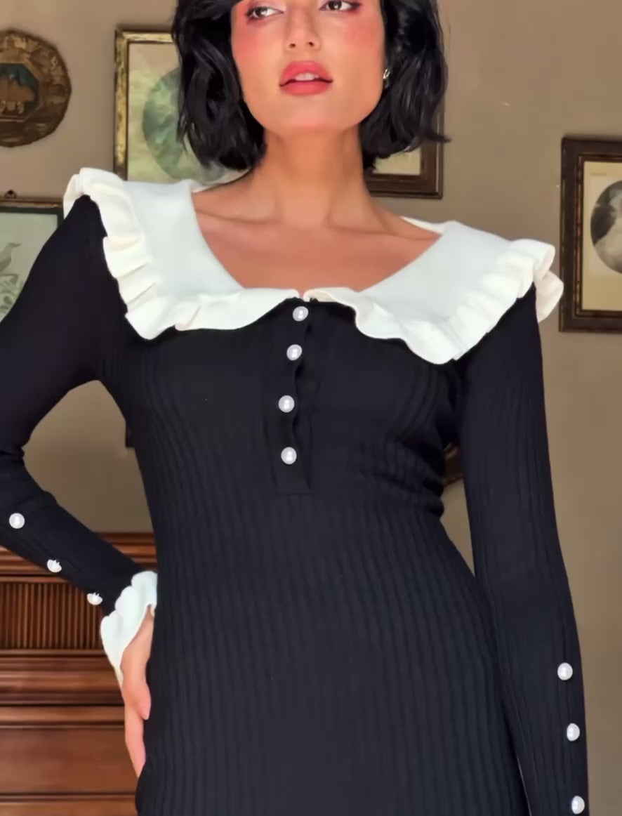 Experience effortless elegance with the Long Sleeve Ruffle Knitted Midi Dress. Its soft, knitted fabric and unique ruffle design make it a perfect choice for both casual and formal occasions. Stay stylish and comfortable all day long with this versatile dress.