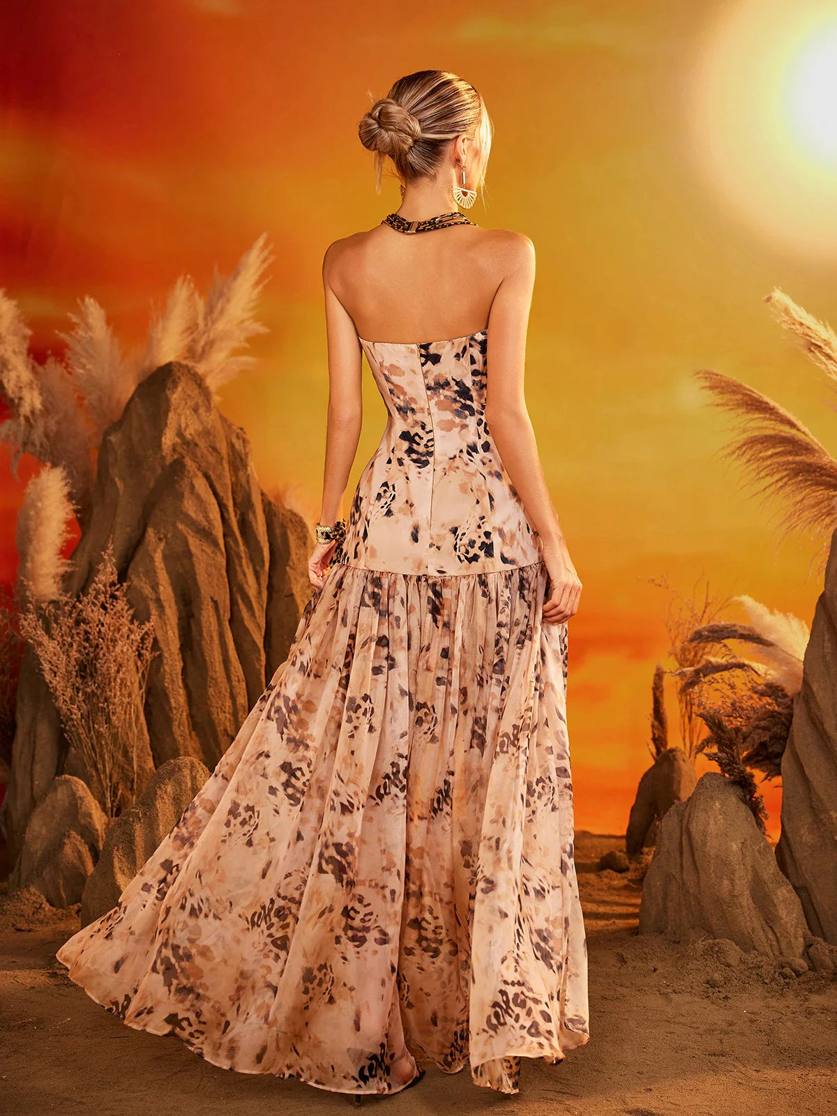 The Sahara Wild Dress fuses effortless elegance with a hint of the untamed. This strapless beauty features a fitted bodice that gently flares into a voluminous, flowing skirt with a dramatic high slit. Crafted in a breezy silk chiffon fabric with abstract leopard-inspired patterns in warm desert hues, it flatters the silhouette while inviting movement and allure. A hidden back zip closure ensures a smooth, sculpted fit.
