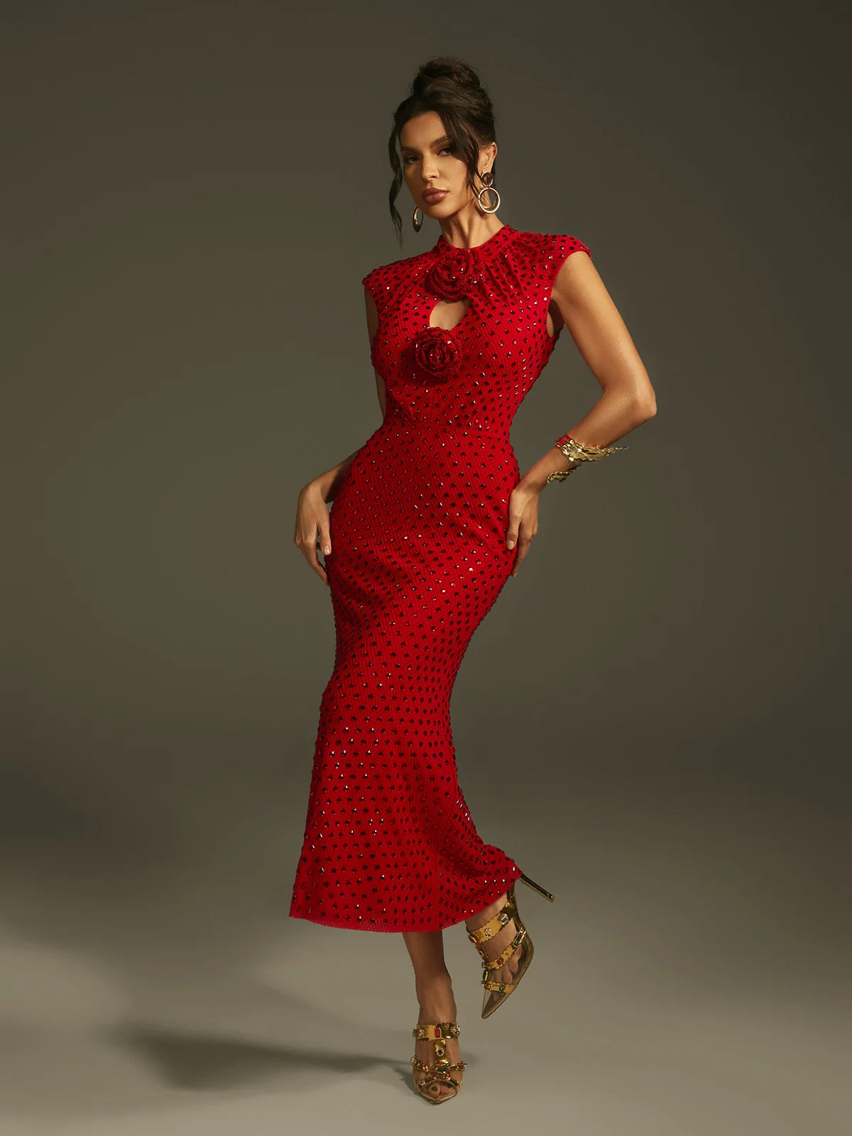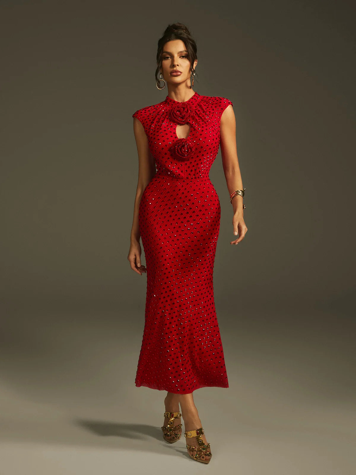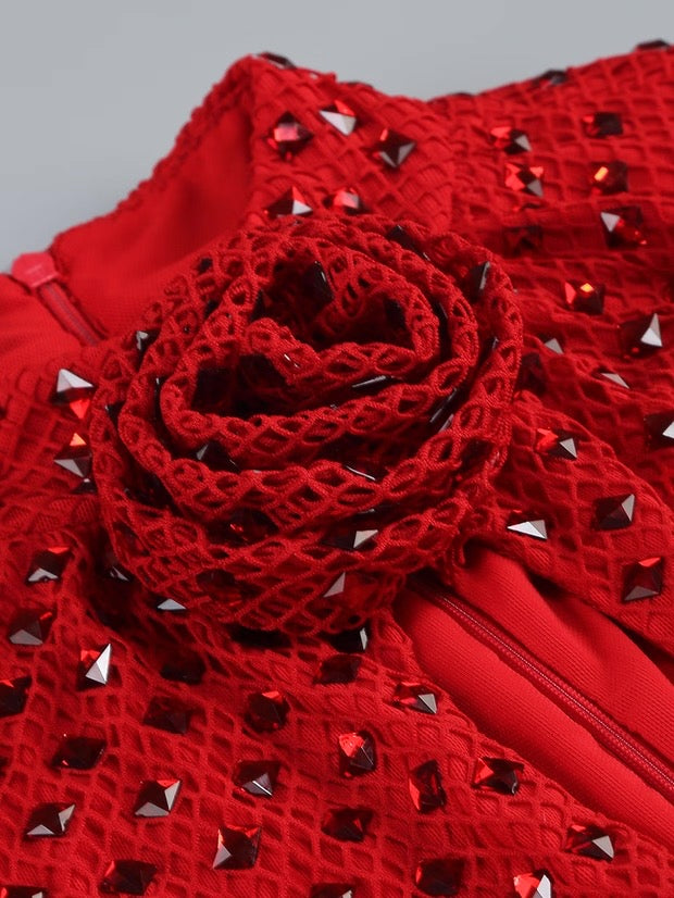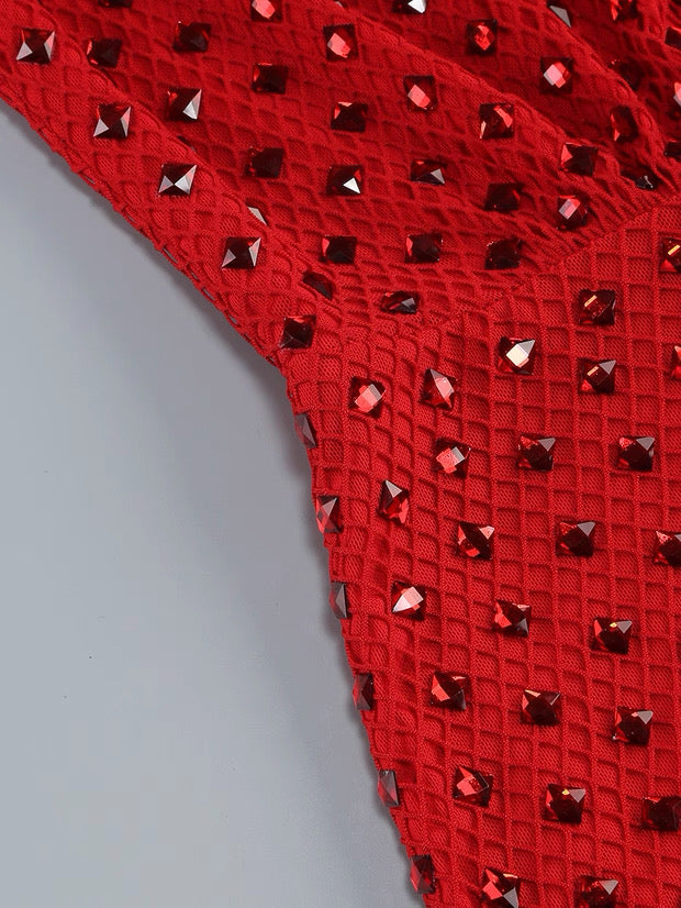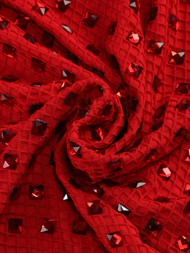 - Luxurious red lattice-textured fabric with hand-applied crystal embellishments