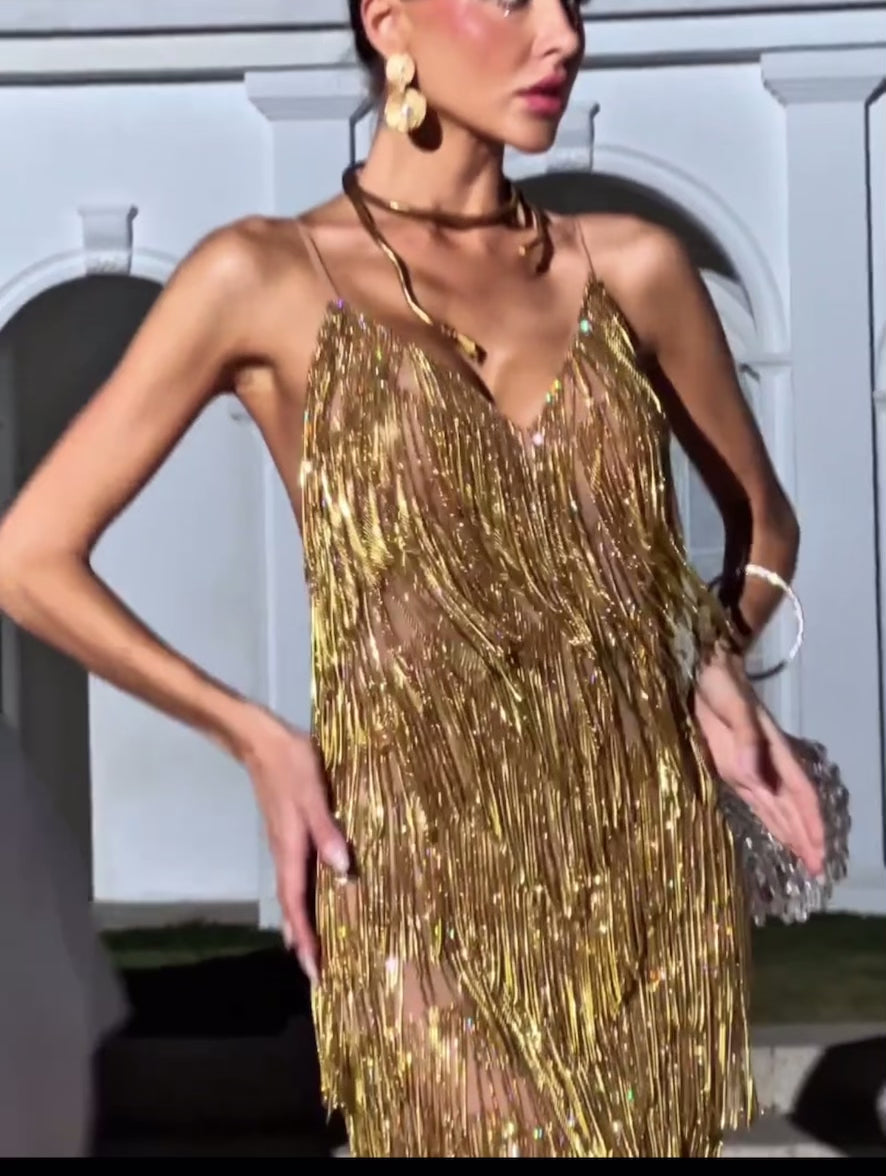 Indulge in the opulence of the Sierra Crystal Chain Fringe Mesh Midi Dress. This luxurious dress features a mesmerizing chain fringe detail, enhancing its elegance and sophistication. The crystal accents add a touch of glamour, making it the perfect statement piece for any special occasion. Elevate your style with this stunning piece of art.