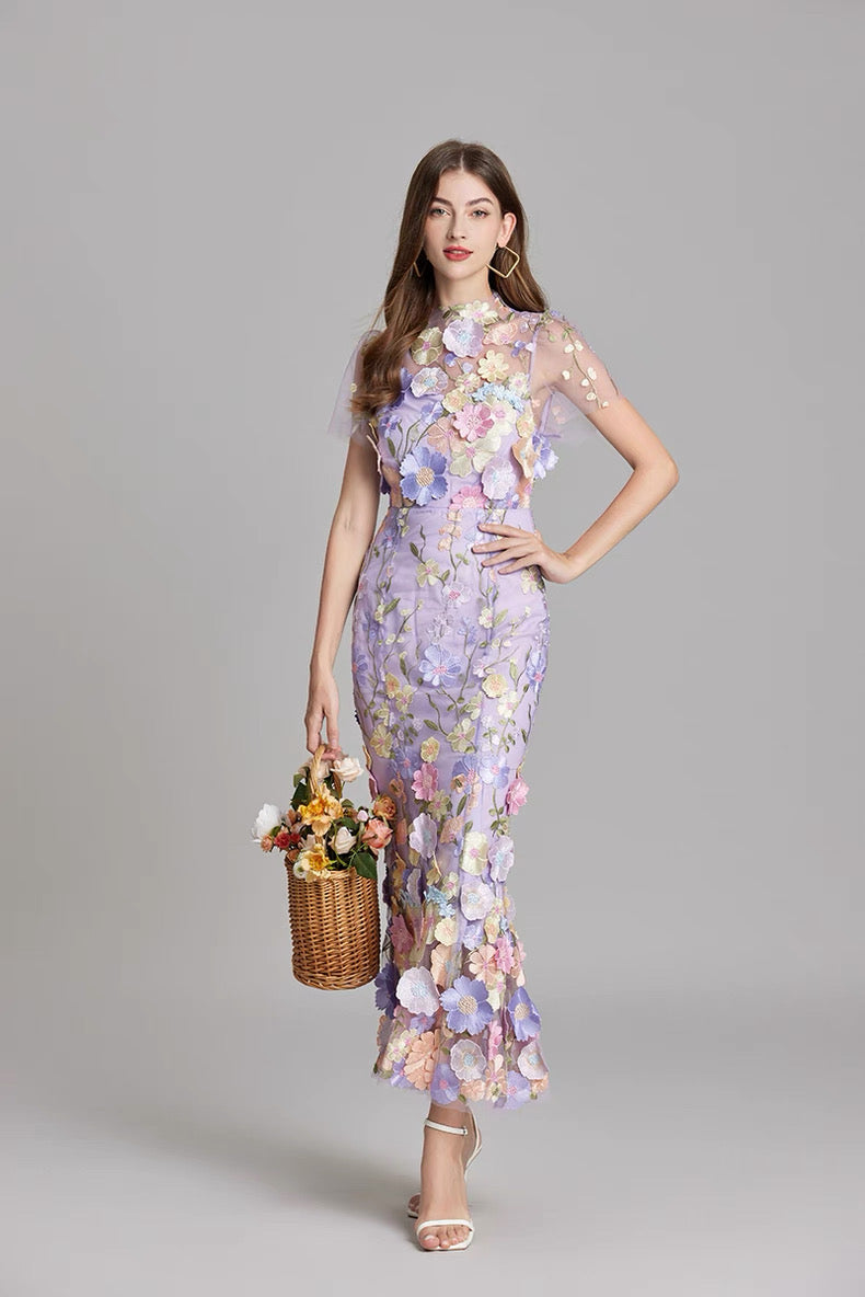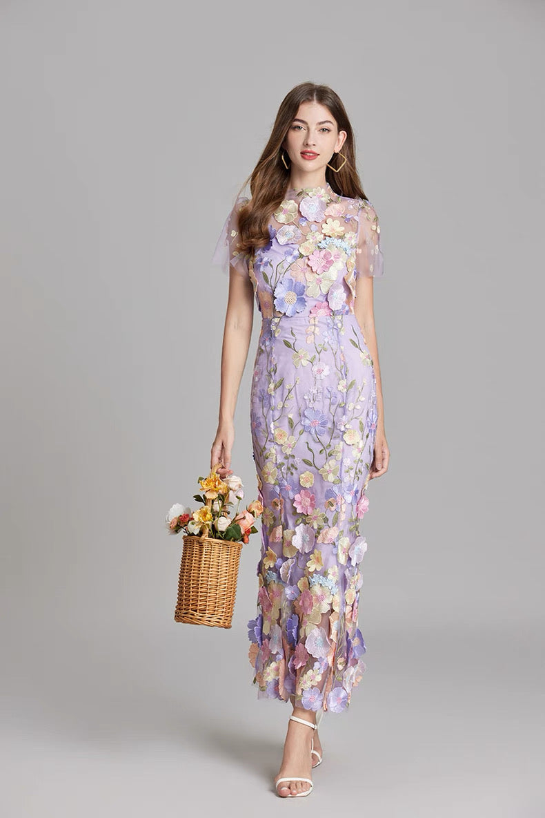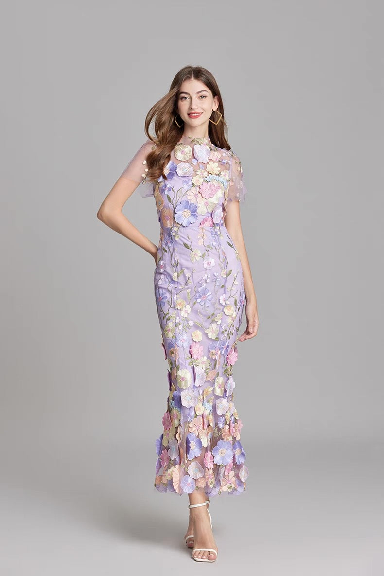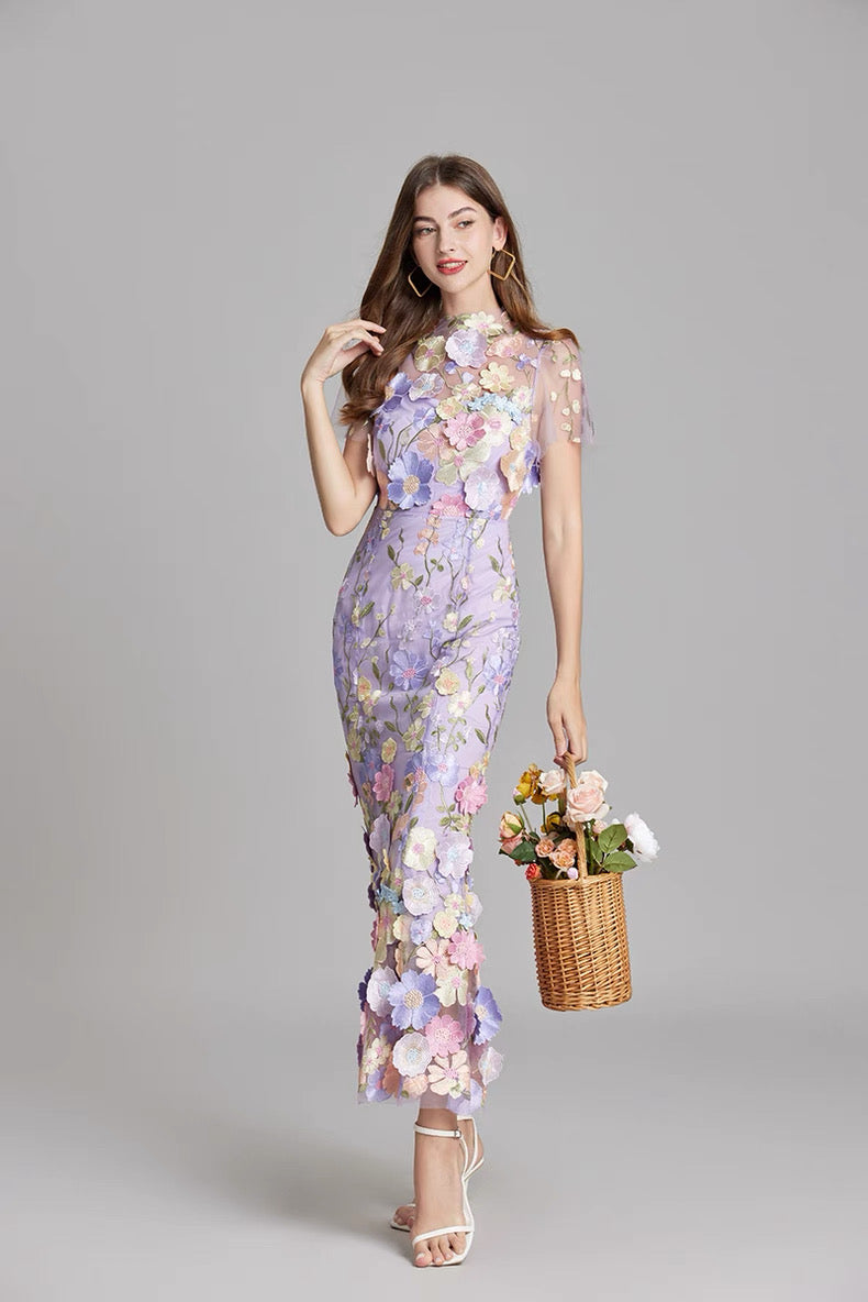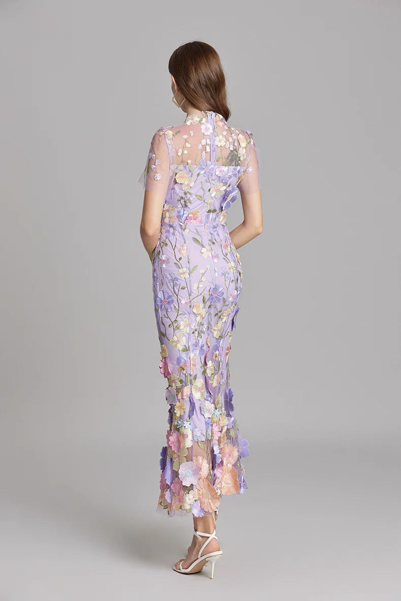 A romantic midi-length dress featuring all-over 3D floral embroidery in vibrant Purple and soft white hues. Designed with a nude illusion base for a barely-there effect, and structured with a fitted silhouette that flares slightly at the hem. The high neckline and short sleeves add elegance, while the floral appliqués cascade from the neckline down to the hem for a garden-fresh effect.