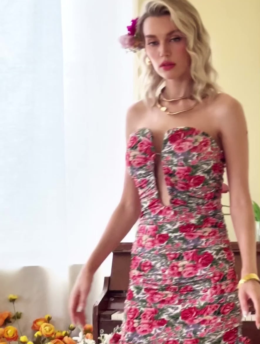 Elevate your wardrobe with the Strapless Cutout Draped Floral Dress. This sophisticated and elegant dress features a unique cutout design and floral detailing. Perfect for special occasions, this dress exudes luxury and exclusivity. Make a statement and stand out in style with the dress.