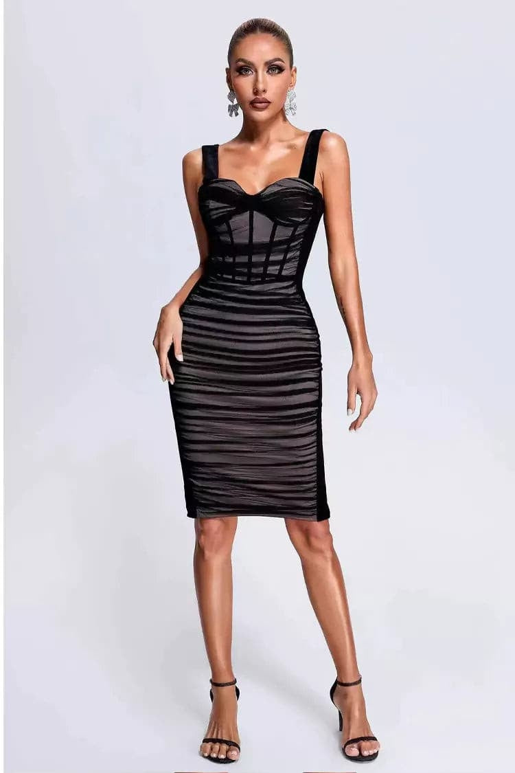 A seductive fusion of structure and sheerness, this midi dress features a bold mesh overlay that highlights the corset-inspired bodice. The bust is softly curved and supported with thick straps, while the boning details create a cinched, contoured silhouette. The back is smooth velvet with a deep V cut and a center slit for ease of movement.