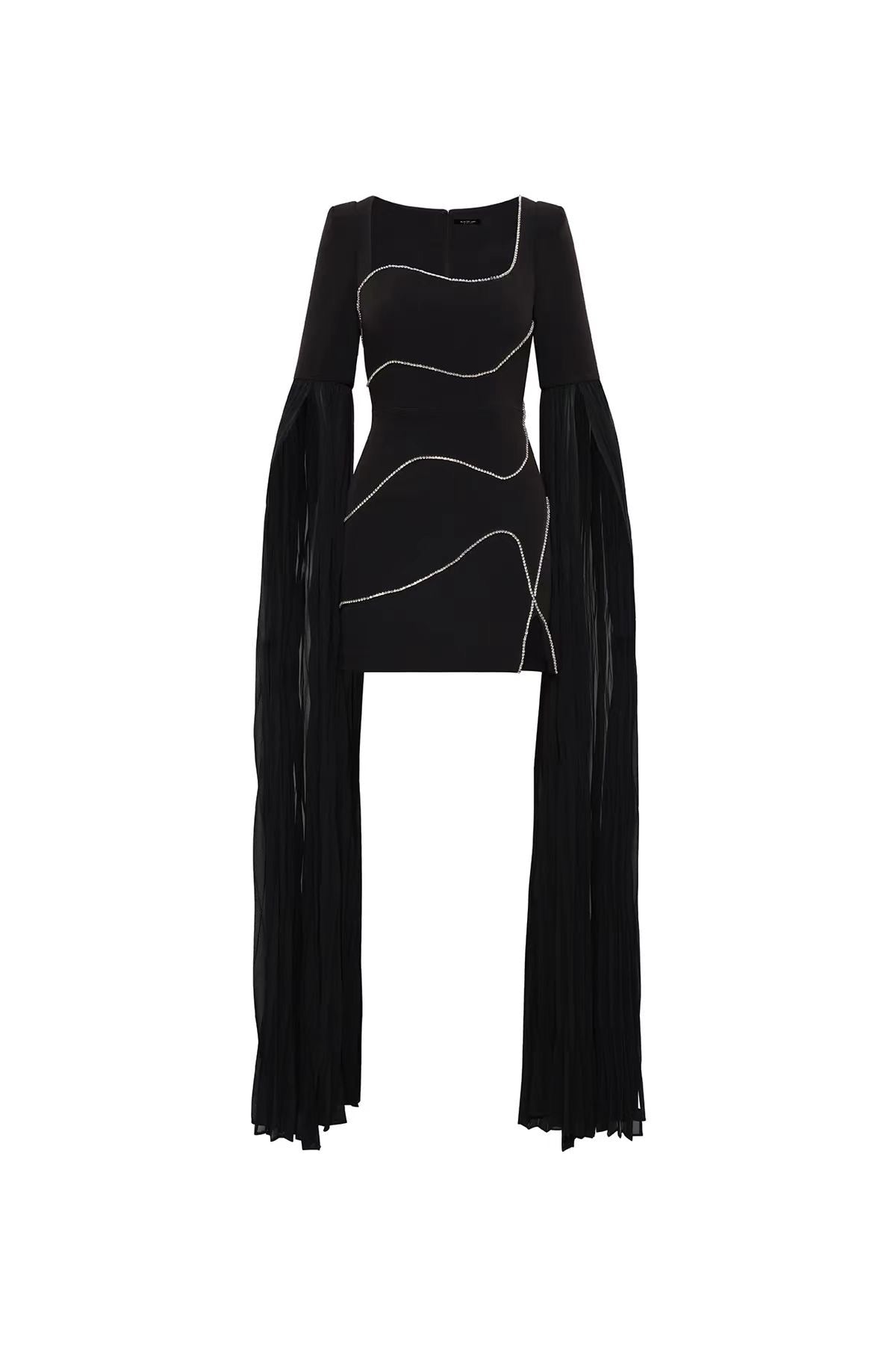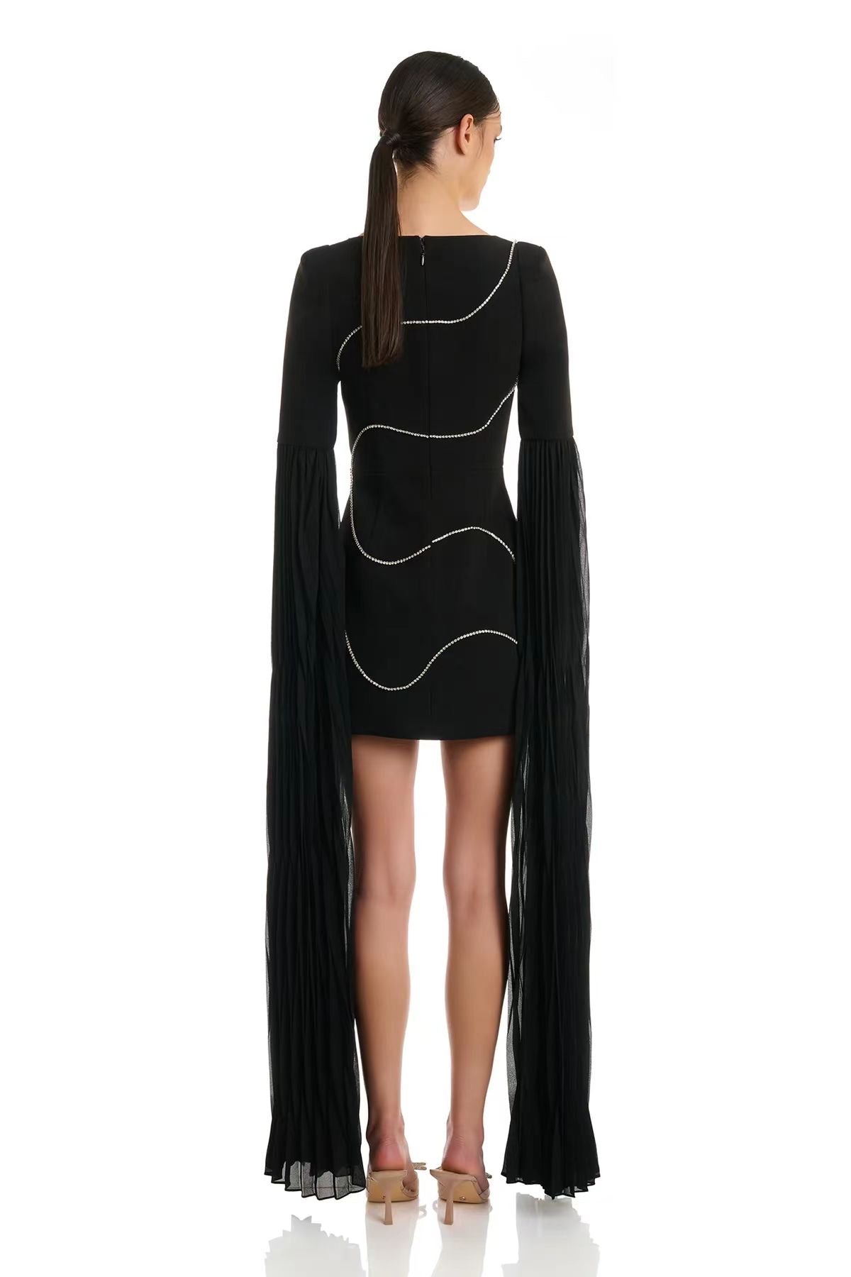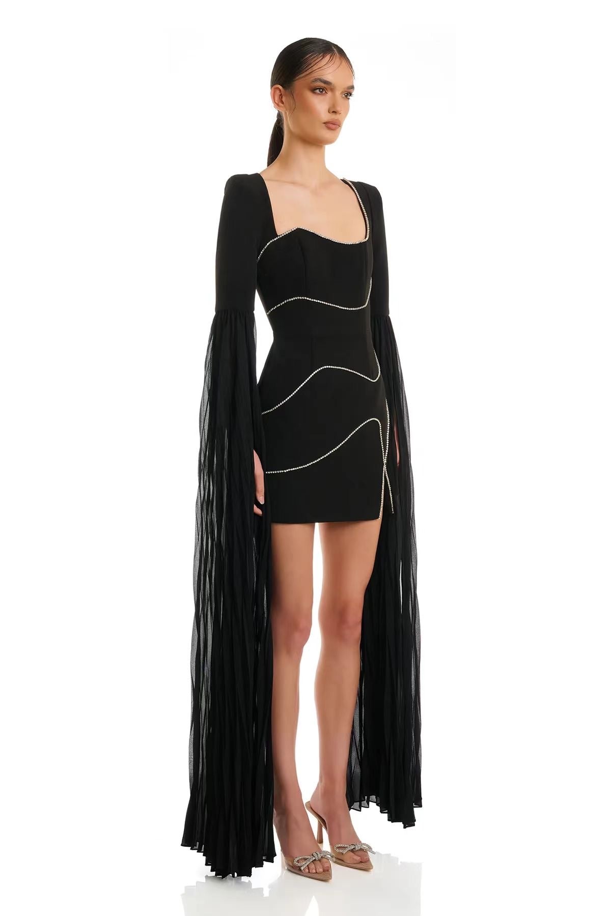 This striking black mini dress features a structured bodice with asymmetrical rhinestone piping and a sweetheart neckline that adds sculptural elegance. The true standout is the long, pleated chiffon panels cascading from the fitted sleeves, creating an avant-garde silhouette that flows with every movement. A side slit enhances the leg line while the back zipper ensures a smooth fit.