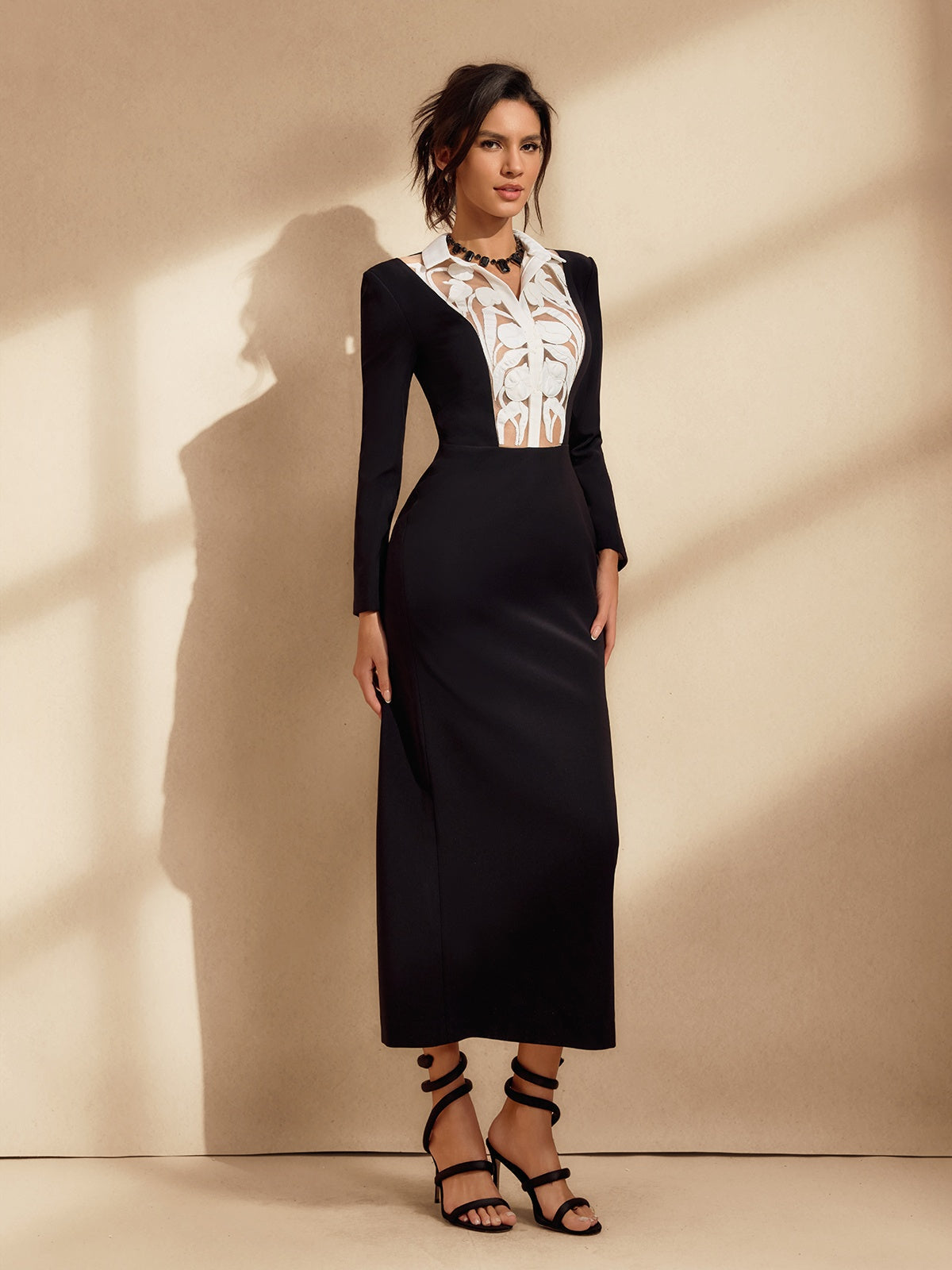 Design Details: A sophisticated long-sleeve gown with a body-hugging silhouette, elegant back slit, and a high-contrast white floral embroidery at the front bodice. The illusion neckline detail adds dimension while keeping the look polished.